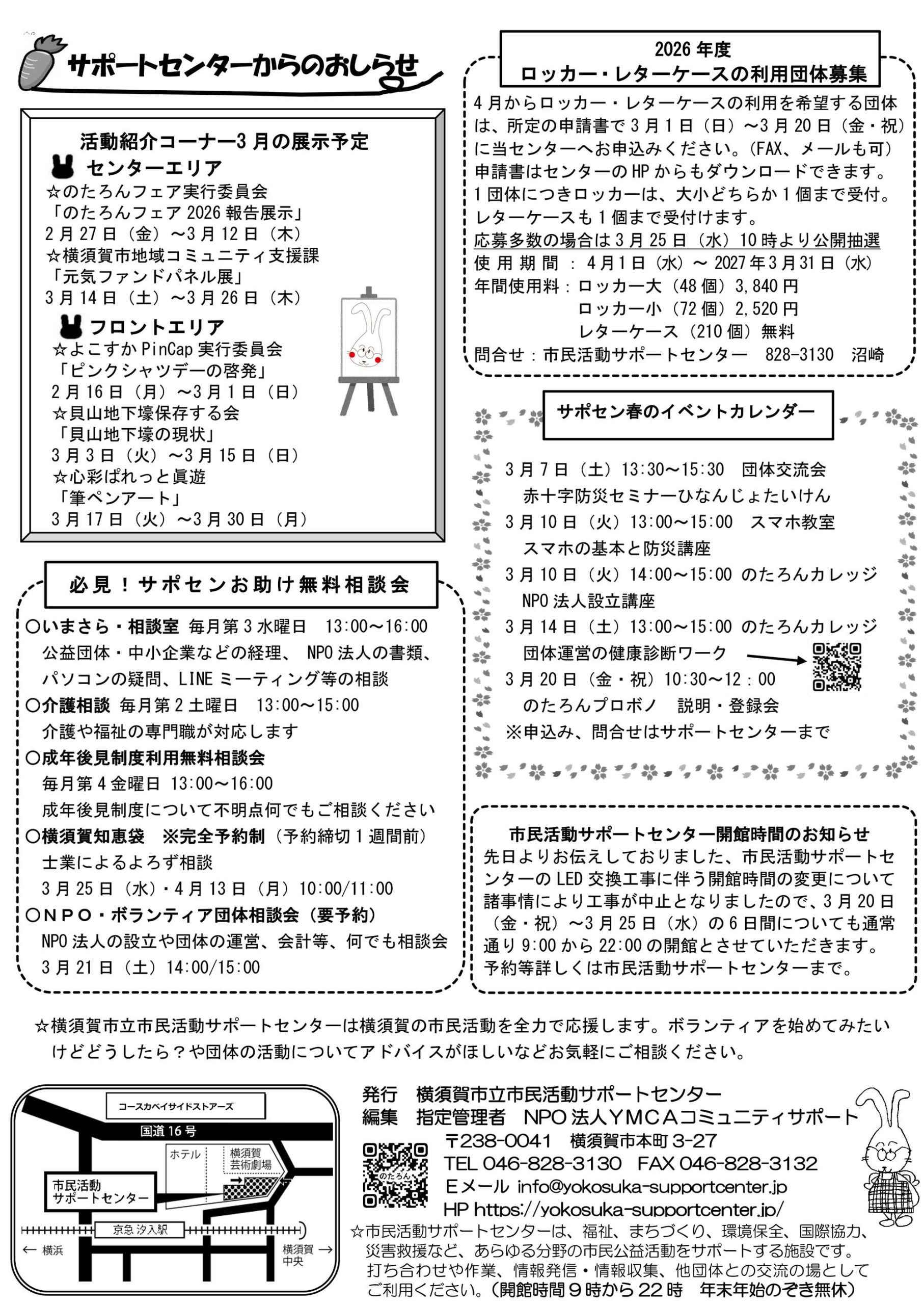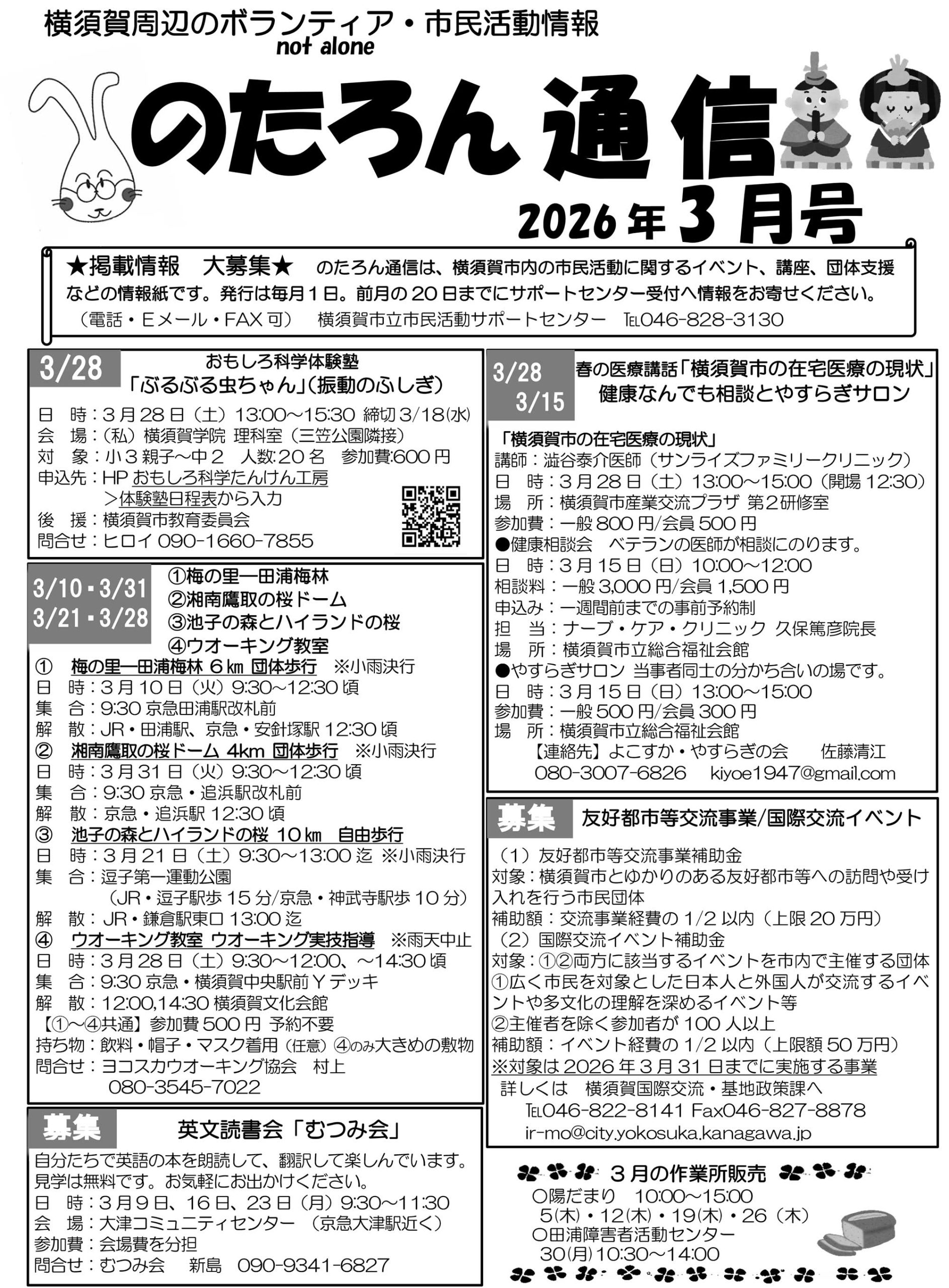 横須賀の市民活動情報誌「のたろん通信」は、その月の市民活動団体のイベントやお知らせ、活動に役立つ情報がぎゅっとつまっています。 横須賀市内、近郊の駅構内、金融機関、行政施設、サポートセンターに置いてあります。
