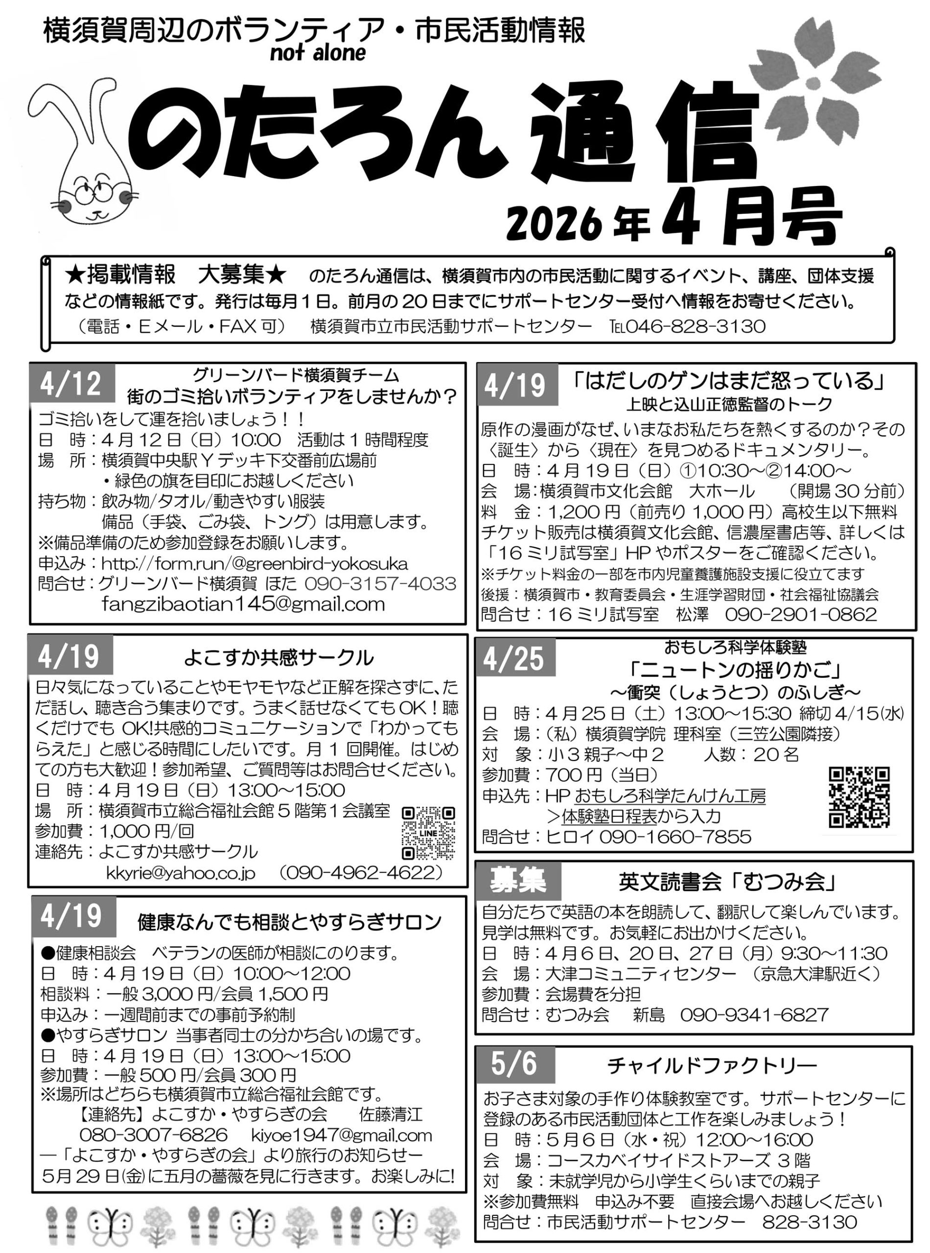 ⇒ 【PDF】のたろん通信2026年度4月号(2026年4月1日発行)950KB